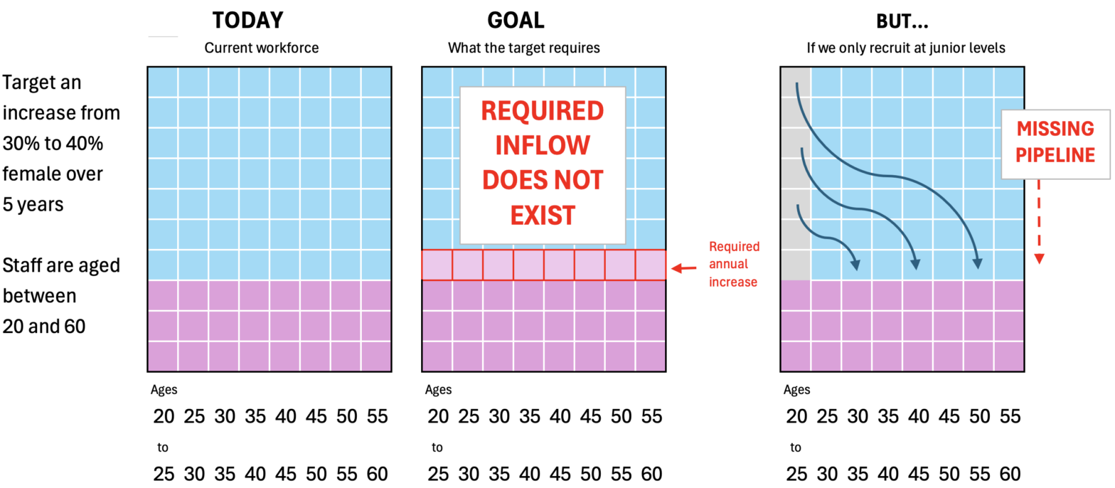 Even if a firm with 30% female staff recruits 50% women every year, it may still take decades for the overall workforce to reach gender parity if careers are long and turnover is low.